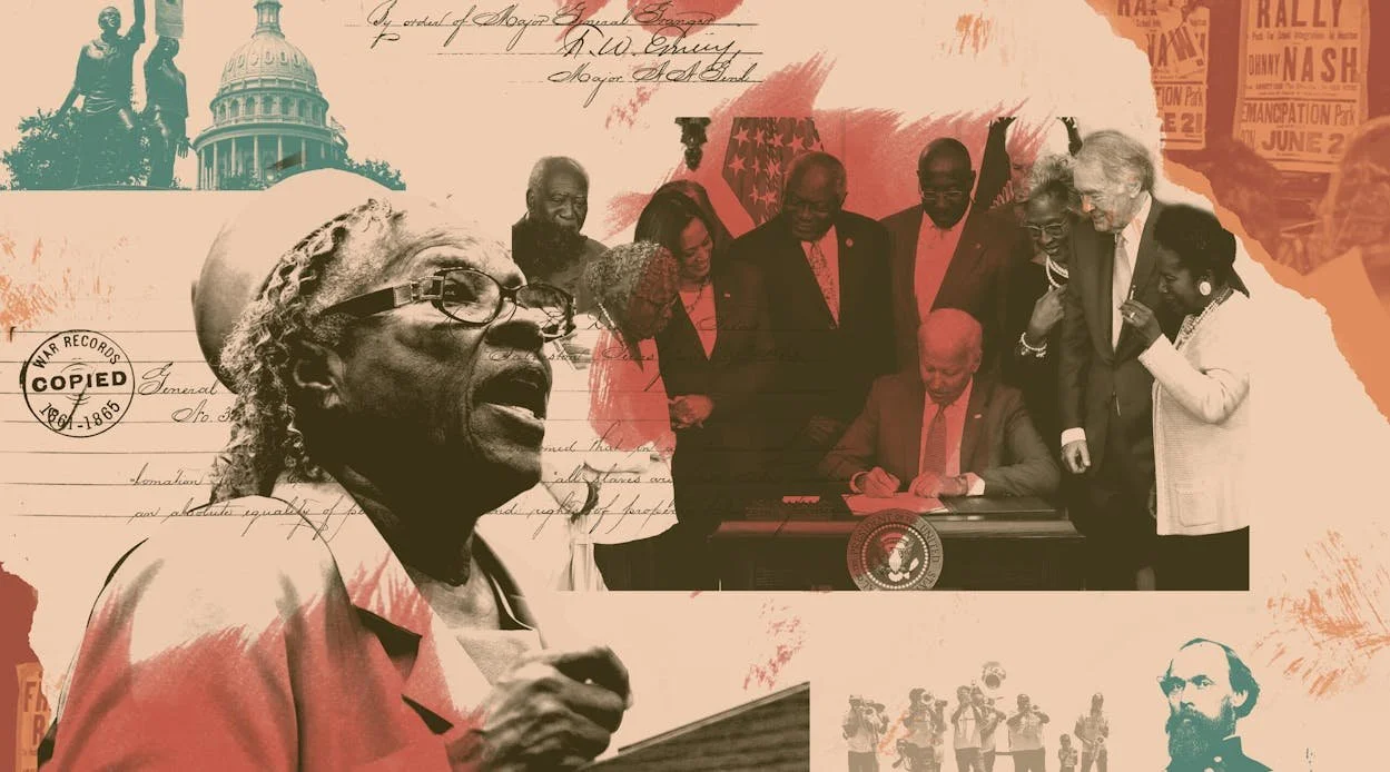 Two African Americans the moment they are told that slavery was over and had been over for 900 days. A true depiction of Juneteenth.